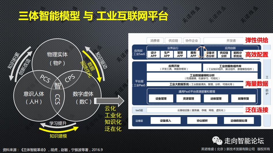 赵敏从讲解三体智能模型入手,指出智能制造第一步是通过CPS实现联接,提出走向智能制造的三部曲:数字化一切可以数字化的事物、网联一切可以联接的事物、由数据的自由流动而实现知识泛在。工业互联网平台作为新一代信息通信技术与现代工业技术深度融合的产物,是三体智能模型中数字虚体的转型升级,是数字虚体CYBER的云化、工业化、知识化和泛在化。