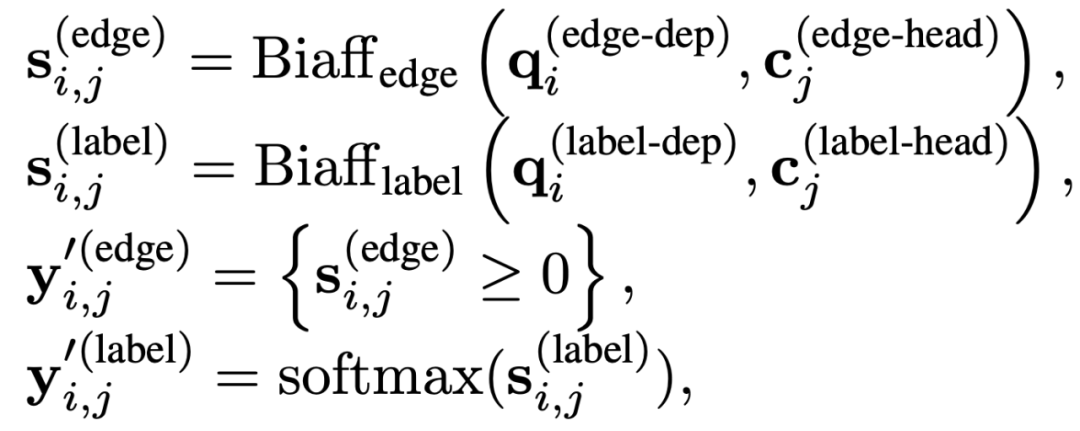 他们参考语义依存分析的方法对 Schema Dependency 任务进行建模,首先使用全连接网络分别获取每个节点作为父亲节点和作为孩子节点的语义表示,然后使用双仿射网络预测每个边存在的概率和该边关系类型的概率: