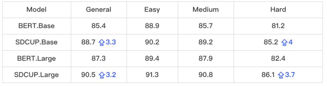 在 TaBLUE 数据集上,SDCUP 的 base 和 large 模型相比同参数规模的 BERT 模型分别提升 3.3 和 2.9 个百分点,并且随着数据难度的增大提升幅度也逐渐增大,体现出 SDCUP 模型对于复杂 NL2SQL 数据具有更好的建模能力。