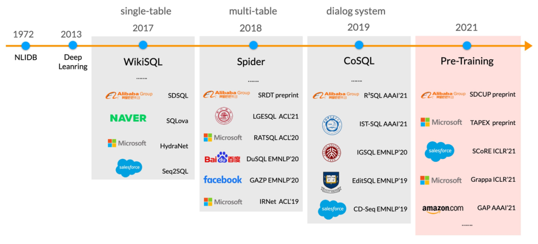 表格问答技术在金融、政务、教育、医疗等场景均有广泛应用前景,因此受到了学术界和工业界的高度关注。以 Text-to-SQL 解析任务为例,自从 2017 年 Salesforce 发布 WikiSQL 数据集以来,就一直受到业界的持续关注和投入,SQL 解析的准确率已经从 2017 年的 35% 提升到 2021 年的 91%。另外,业界也在持续构建更加复杂、更加符合真实场景的数据集,从单表到多表、从单轮到多轮,为该方向的发展不断注入活力。