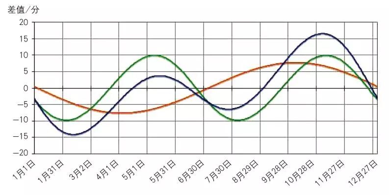 由平太阳日与真太阳日差值的累计导致的钟表中午与日晷正午的差别被称为均时差(蓝色)。均时差由公转轨道偏心率(棕色)和黄赤交角(绿色)两部分合成。均时差在11月初达到极大值约16分25秒(正午偏早),2月中旬达到最小值约14分15秒(正午偏晚)。 图/USNO