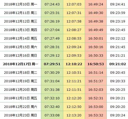 北京近期日出、正午、日落时间和昼长。可见虽然12月22日那天昼长最短,但却不是日出最晚、日落最早的那天