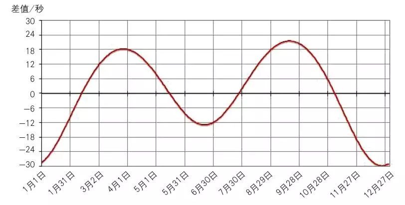 一年中平太阳日与真太阳日的差值,9月下旬达到极大值(真太阳日最短),12月下旬达到极小值(真太阳日最长)。 图/USNO
