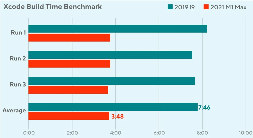 图2:2019年英特尔i9 MacBook Pro和2021年M1 Max MacBook Pro上对我们的基准项目进行多次 "清理 "构建的时间比较