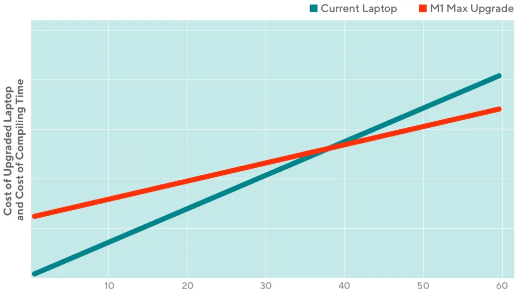 图1:新旧笔记本电脑的 "编译时间 "成本对比图显示,硬件升级的一次性成本很快就能收回