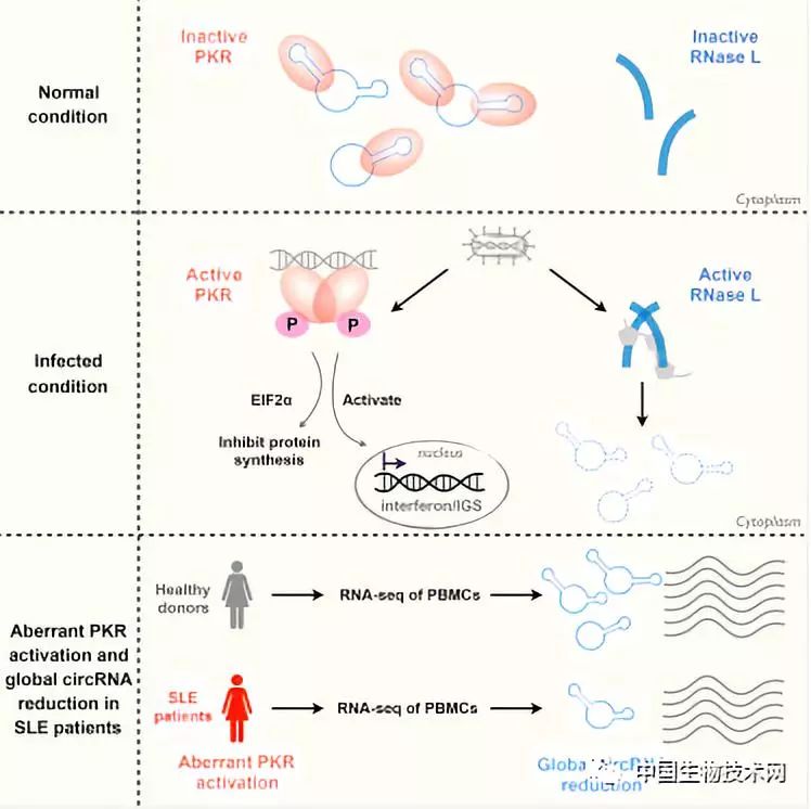众所周知,红斑狼疮是一类人体自身免疫系统出现故障的疾病。研究人员通过检测系统性红斑狼疮病人体内免疫细胞发现,环形RNA含量相对正常人明显降低,PKR免疫因子一直处于过度激活状态,从而引发体内免疫应答系统过度“运转”。科研人员通过使用技术手段让环形RNA在病人来源的免疫细胞内数量增多,可以观察到过度激活“运转”的天然免疫因子PKR及其下游免疫信号通路被显著“控制”,进一步提示环形RNA就像参与天然免疫系统调控稳定的“天使”一样,管理着抗病毒“卫士”PKR的活性。