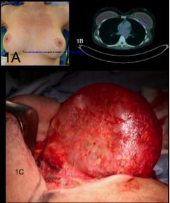 患者女,68岁,左乳肿物4周就诊,7年前患侵袭性乳腺导管癌,T3N2MX,ER/PR阳性,Her2阴性,行左乳切除、术后辅助化疗和乳房重建,3个月前停用芳香化酶抑制剂。超声见毛面假体周围有300ml血肿,MRI见血肿包绕假体,假体包膜上有一1cm肿物。