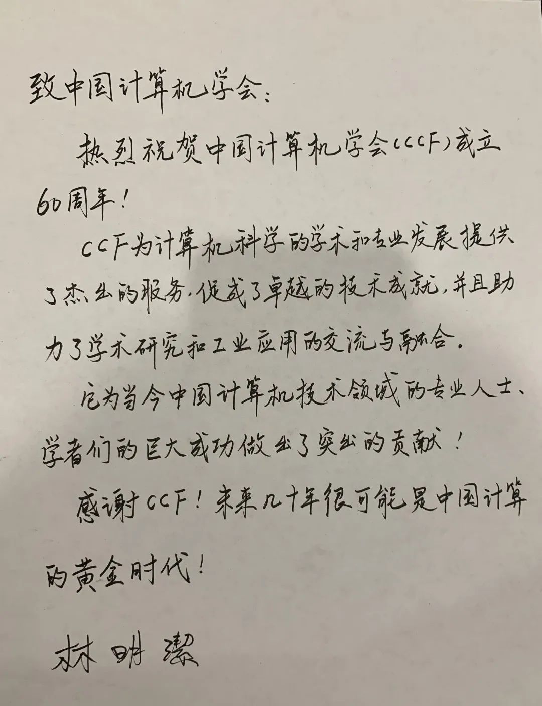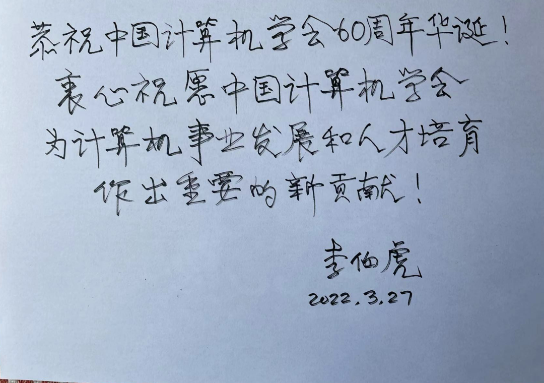 2022年正值CCF创建60周年,我们将陆续分享收到的贺信和贺电,共同祝福CCF60岁华诞!