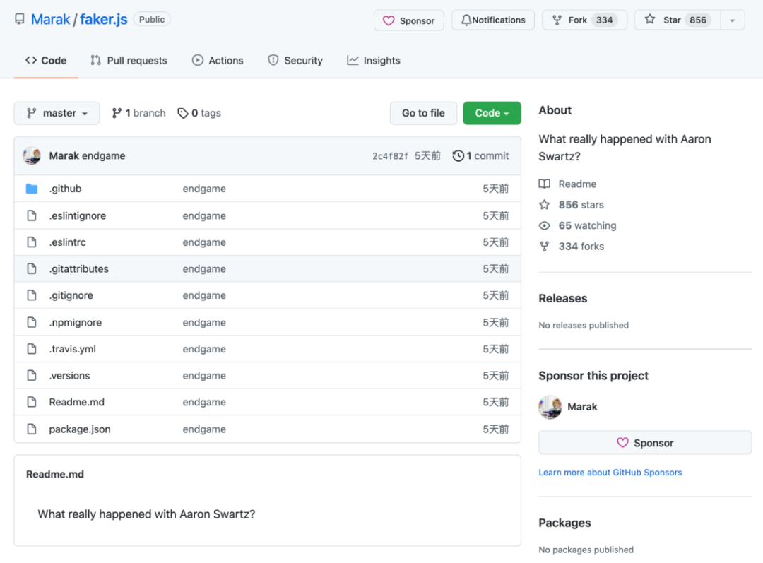 现在,faker.js 项目的所有 commit 信息都被改为「endgame」,在 README 中,作者写下这样一句话:「What really happened with Aaron Swartz?」