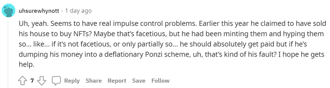 甚至有人认为 Marak 这么做是一种冲动行为,不够理性,并和他之前「卖掉房子购买 NFT」的传闻联系起来,认为 Marak 需要学会控制自己的情绪: