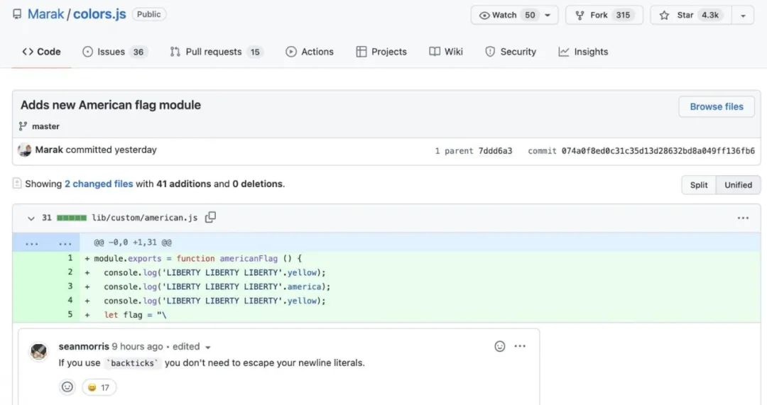 Marak Squires 向 colors.js 提交了恶意代码,添加了一个「a new American flag module」,然后将其发布到了 GitHub 和 npm。
