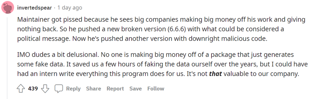 有网友认为 faker.js 团队的反应有些夸张了,并说道:「没有人会用一个只生成一些虚假数据的包赚大钱。faker.js 的确为开发者生成伪数据节省了一些时间,但我们也可以让实习生编写类似程序来生成数据。这对企业来说并没有那么重要。」