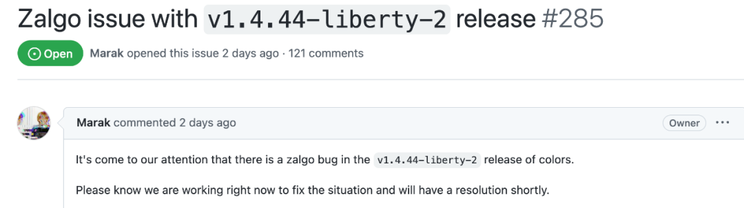 「我们注意到在 v1.4.44-liberty-2 版本的 colors 中有一个 zalgo 错误,」Squires 以一种讽刺的语气写道。「我们现在正在努力解决这个问题,很快就会有解决方案。」