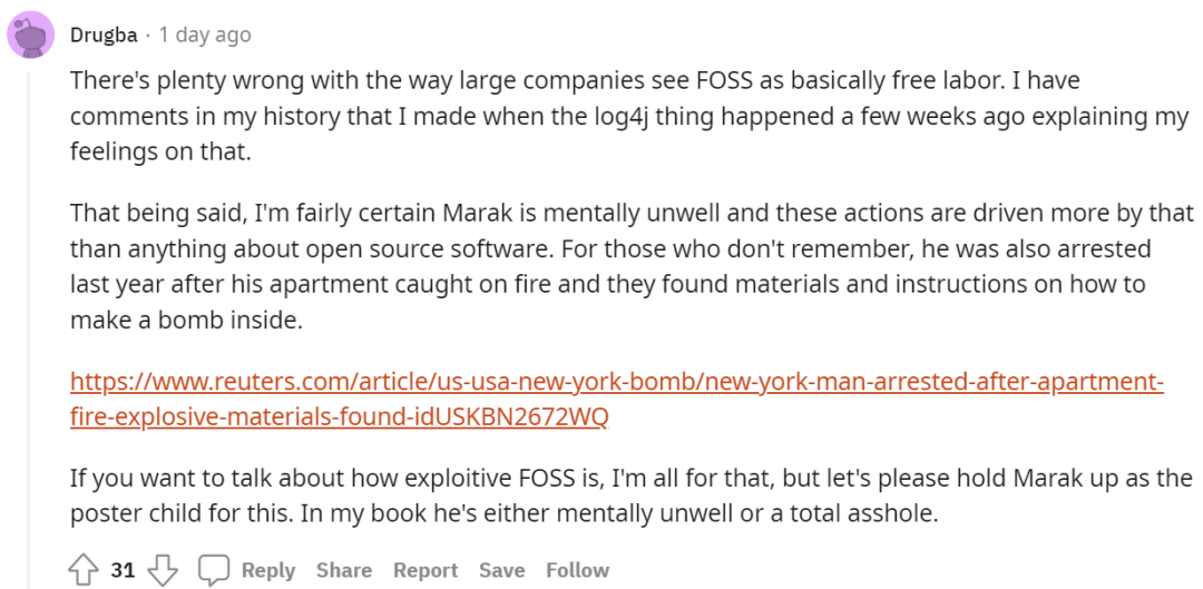 有人表示:一些大公司确实不尊重开源项目的版权,滥用开源项目对于 FOSS 开发者来说是绝对不公平的。但 Marak 对 faker.js 的做法并不可取,不是正面例子,存在 Marak 的个人负面原因。