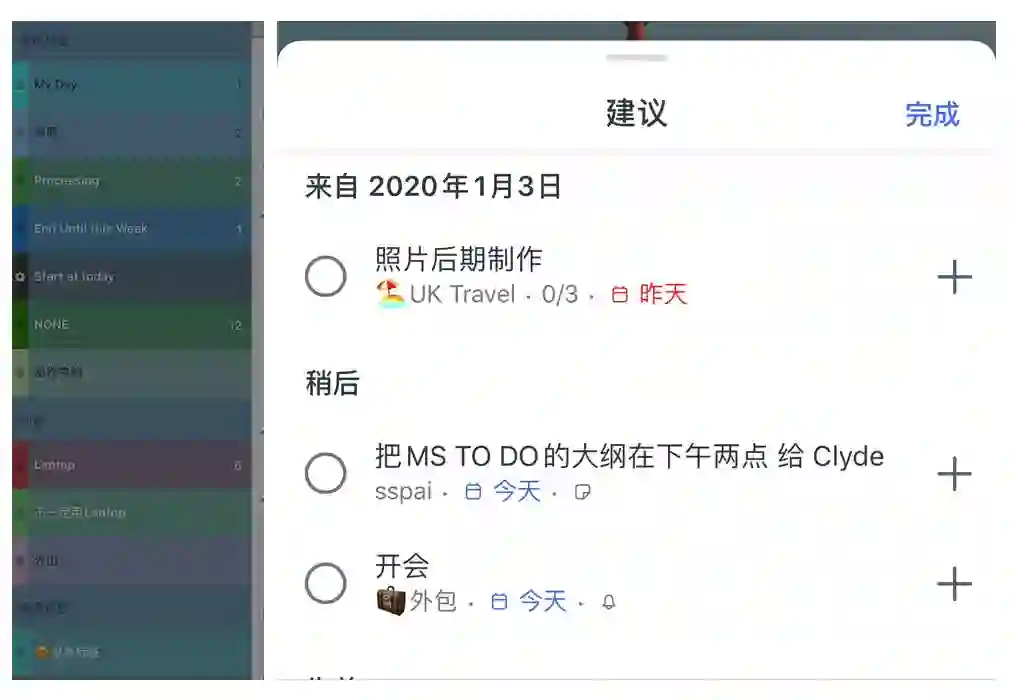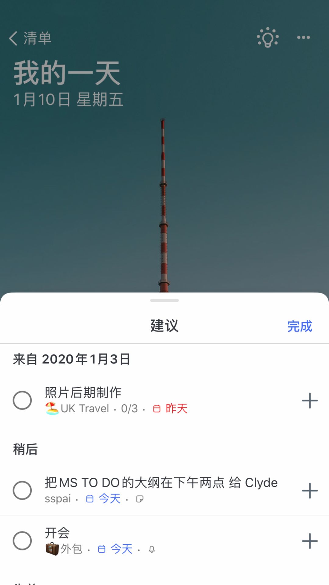 但回顾任务是一个很难养成和坚持的习惯,「我的一天」 很好地解决了这个问题。进入「我的一天」界面后,微软待办根据最近即将到期或已经到期的任务进行智能建议,同时使用算法挑选出一部分没有到期日期和到期日期距现在非常远的任务放到建议里,弱化了「到期日」这一概念,让我们专注于「今天要完成哪些任务」这件事本身。