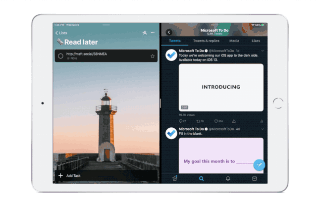 在 iOS/iPadOS 上,微软待办提供了 Siri 快捷指令、富通知的支持、Drag and Drop(创建任务、创建任务笔记、移动任务)等等特性支持。其中我最喜欢的功能就是 Drag and Drop,在 iPad 上看到任何想要添加为任务的内容,你都可以飞快地将他们添加成任务;也可以批量地将任务从一个列表里放到另外一个列表里,非常符合在 iPad 上的使用逻辑。