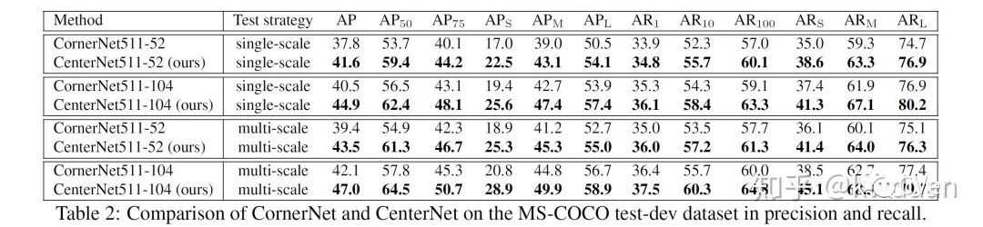 Table3 为错误目标框的去除实验的对比。实验结果表明 CenterNet 去除了大量的错误目标框,尤其是小尺度的错误目标框,这也是为什么小尺度目标的 AP 提升最多的原因。