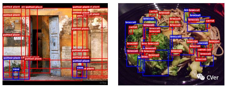 其实不光是基于关键点的 one-stage 方法无法感知物体内部信息,几乎所有的 one-stage 方法都存在这一问题。本论文的 baseline 为 CornerNet,因此首先讨论 CornerNet 为什么容易产生很多的误检。首先,CornerNet 通过检测角点确定目标,而不是通过初始候选框 anchor 的回归确定目标,由于没有了 anchor 的限制,使得任意两个角点都可以组成一个目标框,这就对判断两个角点是否属于同一物体的算法要求很高,一但准确度差一点,就会产生很多错误目标框。其次,恰恰这个算法有缺陷。因为此算法在判断两个角点是否属于同一物体时,缺乏全局信息的辅助,因此很容易把原本不是同一物体的两个角点看成是一对角点,因此产生了很多错误目标框。最后,角点的特征对边缘比较敏感,这导致很多角点同样对背景的边缘很敏感,因此在背景处也检测到了错误的角点。综上原因,使得 CornerNet 产生了很多误检。如图2所示,我们用 CornerNet 对两张图片进行检测,根据每个预测目标框的 confidence 选出 top100 个预测框 (根据 MS COCO 标准),可以发现产生了很多误检。其中蓝色框为 ground truth, 红色框为预测框。