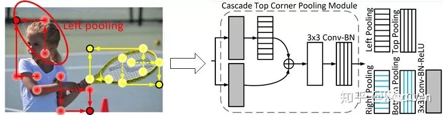 Cascade corner pooling: 一般情况下角点位于物体外部,所处位置并不含有关联物体的语义信息,这为角点的检测带来了困难。图7(b) 为传统做法,称为 corner pooling。它提取物体边界最大值并相加,该方法只能提供关联物体边缘语义信息,对于更加丰富的物体内部语义信息则很难提取到。图7(c)为cascade corner pooling 原理,它首先提取物体边界最大值,然后在边界最大值处继续向内部(图中沿虚线方向)提取提最大值,并与边界最大值相加,以此给角点特征提供更加丰富的关联物体语义信息。Cascade corner pooling 也可通过不同方向上的 corner pooling 的组合实现,如图8 所示,图8展示了cascade left corner pooling 原理。