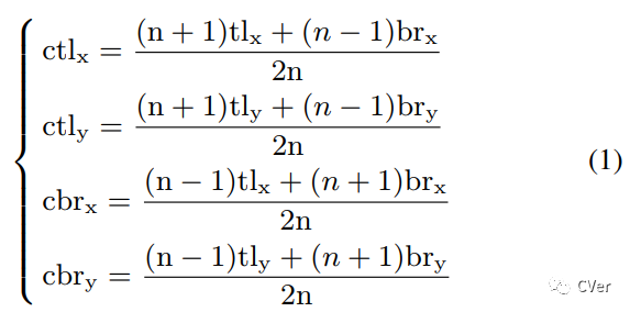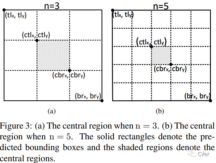 我们发现中心区域的尺度会影响错误框去除效果。中心区域过小导致很多小尺度的错误目标框无法被去除,而中心区域过大导致很多大尺度的错误目标框无法被去除,因此我们提出了尺度可调节的中心区域定义法 (公式1)。该方法可以在预测框的尺度较大时定义一个相对较小的中心区域,在预测框的尺度较小时预测一个相对较大的中心区域。如 Fig3 所示。