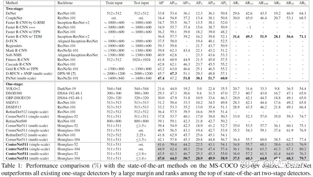 本实验在最具挑战性之一的 MS COCO 数据集上进行测试, 我们选了一些比较有代表性的工作做了对比。实验结果表明 CenterNet 获得了47%的AP,超过了所有已知的 one-stage 检测方法,并大幅度领先,其领先幅度至少达4.9%。Table2为 CenterNet 与 CornerNet 的单独对比。最近目标检测方法在COCO数据集上基本在以百分之零点几的精度往前推进,因为coco数据集难度很高,而我们的 CenterNet 往前推进了将近5个百分点。同时,CenterNet 的结果也接近two-stage方法的最好结果。值得注意的是,CenterNet 训练输入图片分辨率只有 511X511,在 single-scale下,测试图片的分辨率为原图分辨率(~500),在 multi-scale下,测试图片的分辨率最大为原图分辨率的1.8倍。而two-stage的输入图片的分辨率一般最短边也要>600,甚至更大,比如D-RFCN+SNIP [3] 和 PANet [4]。而且我们的方法是 Train from scratch。