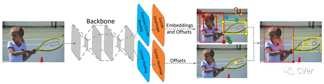 图3为 CenterNet 的结构图。网络通过 center pooling 和 cascade corner pooling 分别得到 center heatmap 和 corner heatmaps,用来预测关键点的位置。得到角点的位置和类别后,通过 offsets 将角点的位置映射到输入图片的对应位置,然后通过 embedings 判断哪两个角点属于同一个物体,以便组成一个检测框。正如前文所说,组合过程中由于缺乏来自目标区域内部信息的辅助,从而导致大量的误检。为了解决这一问题,CenterNet 不仅预测角点,还预测中心点。我们对每个预测框定义一个中心区域,通过判断每个目标框的中心区域是否含有中心点,若有则保留,并且此时框的 confidence 为中心点,左上角点和右下角点的confidence的平均,若无则去除,使得网络具备感知目标区域内部信息的能力,能够有效除错误的目标框。