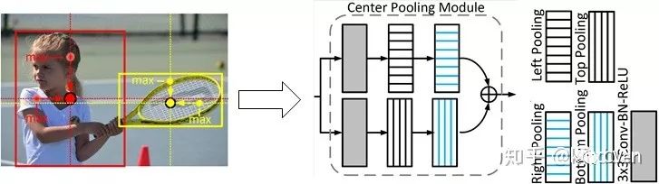 我们分析出了 CornerNet 的问题后,接下来就是找出解决之道,关键问题在于让网络具备感知物体内部信息的能力。一个较容易想到的方法是把 CornerNet 变成一个 two-stage 的方法,即利用 RoI pooling 或 RoI align 提取预测框的内部信息,从而获得感知能力。但这样做开销很大,因此我们提出了用关键点三元组来检测目标,这样使得我们的方法在 one-stage 的前提下就能获得感知物体内部信息的能力。并且开销较小,因为我们只需关注物体的中心,从而避免了 RoI pooling 或 RoI align 关注物体内部的全部信息。