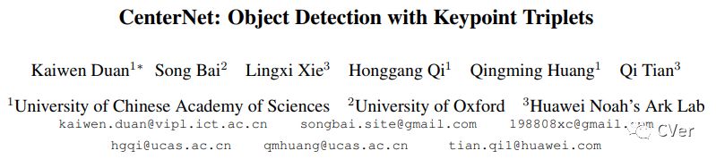我们介绍一篇很好的 one-stage 目标检测论文:CenterNet: Keypoint Triplets for Object Detection,该论文是由中科院,牛津大学以及华为诺亚方舟实验室联合提出。截至目前,据我们所知,CenterNet 应该是 one-stage 目标检测方法中性能最好的方法。