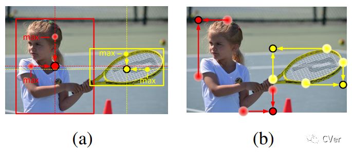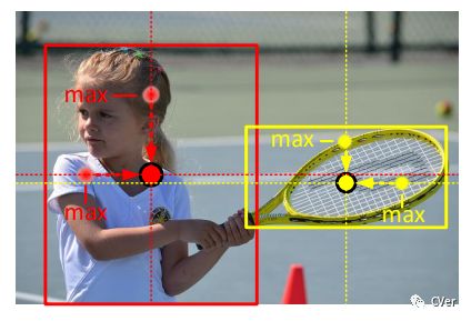 Center pooling:一个物体的中心并不一定含有很强的,易于区分于其他类别的语义信息。例如,一个人的头部含有很强的,易于区分于其他类别的语义信息,但是其中心往往位于人的中部。我们提出了center pooling 来丰富中心点特征。图5为该方法原理,center pooling提取中心点水平方向和垂直方向的最大值并相加,以此给中心点提供所处位置以外的信息。这一操作使中心点有机会获得更易于区分于其他类别的语义信息。Center pooling 可通过不同方向上的 corner pooling 的组合实现。一个水平方向上的取最大值操作可由 left pooling 和 right pooling通过串联实现,同理,一个垂直方向上的取最大值操作可由 top pooling 和 bottom pooling通过串联实现,如图6所示。