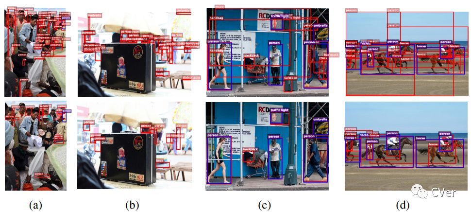 CenterNet 以 CornerNet为 baseline,后者为最具代表性的基于关键点的目标检测方法。上图展示了 CenterNet 与 CornerNet 的对比结果。(a) 和 (b) 表明 CenterNet 能有效去除小尺度的错误目标框。(c) 和 (d) 表明 CenterNet 能有效去除中等尺度和大尺度的错误目标框。