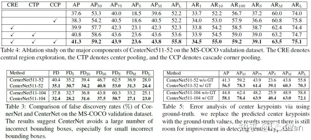 Table4 为消除实验。第一行为 CornerNet 结果。中心点的加入 (CRE) 使得网络提升了2.3% (37.6% vs 39.9%)。对于中心点的检测,本实验使用传统的卷积操作进行。其中小尺度目标提升的最多,提升了4.6% (18.5% vs 23.1%), 而大尺度目标几乎没有发生变化。这说明小尺度的错误目标框被去除的最多,这是因为从概率上讲,小尺度目标框由于面积小更容易确定其中心点,因此那些错误的小目标框不在中心点附近的概率更大,因此去除的最多。Center pooling (CTP) 的加入使网络进一步提升了0.9%。值得注意的是,大尺度目标提升了1.4% (52.2% vs 53.6%),小目标和中等目标也得到了一定的提升,这表明 center pooling 能够使中心点获得更易于区分于其他类别的语义信息。Cascade corner pooling (CCP) 使得使网络性能进一步提升。第二行的试验中,我们将 CornerNet 的corner pooling 替换成了 cascade corner pooling,性能提升了0.7% (37.6% vs 38.3%)。可以观察到大目标的 AP 没有发生变化,AR 却提升了1.8% (74.0% vs 75.8%), 这说明 cascade corner pooling 通过加入了物体内部信息能够感知更多的物体,但是由于大目标由于面积过大,使其容易获得较明显的内部特征而干扰了边缘特征,因此使得预测出的目标框位置不精确。当结合了 CRE 后,由于 CRE 能够有效去除错误目标框,因此使大目标框的AP得到了提升 (53.6% vs 55.8%).