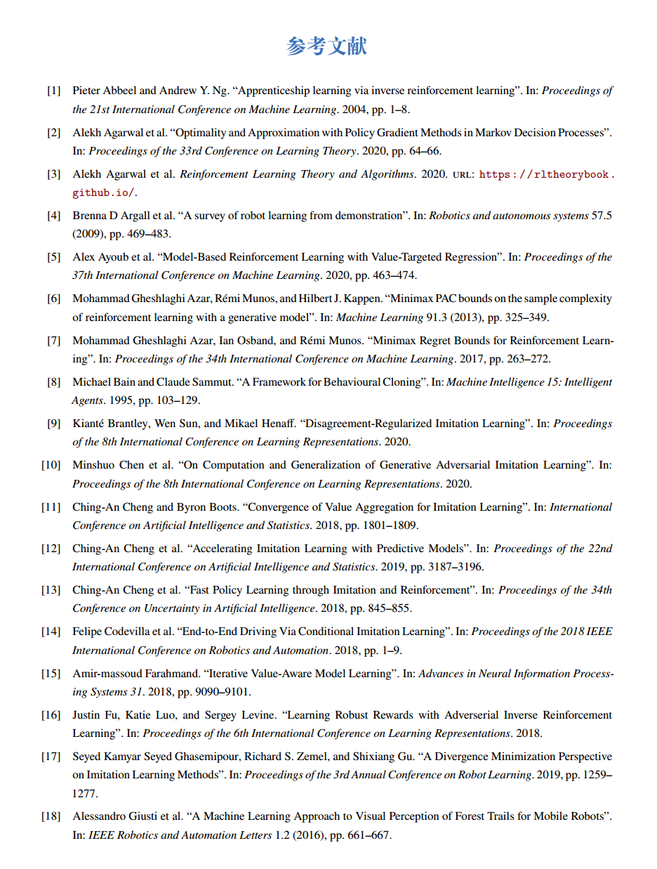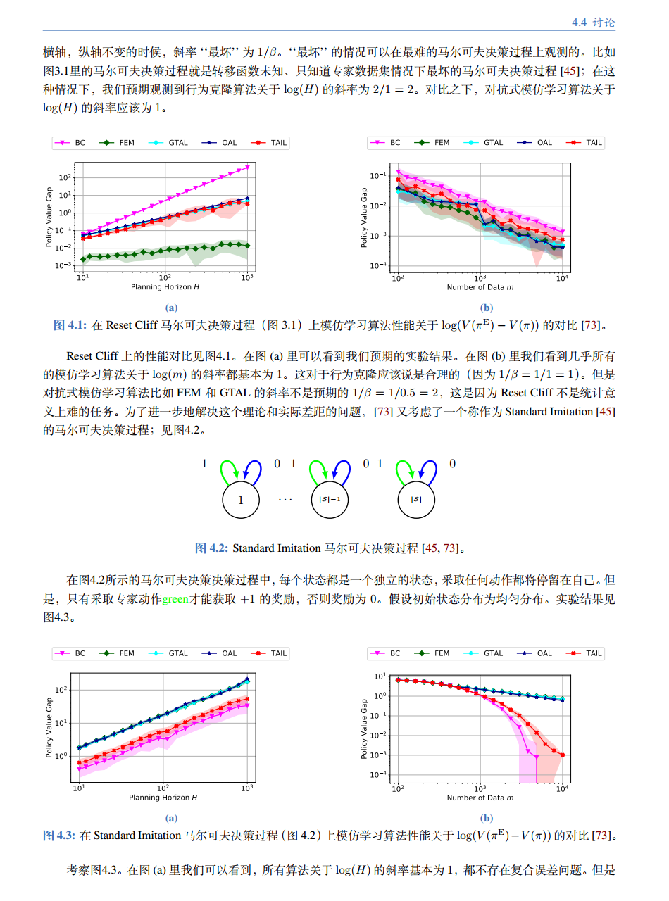 模仿学习,是一种从专家示例中进行学习的方法。这里专家示例指的是由最优(或者次优)策略采集到的状态-动作序列,智能体便是通过模仿专家示例来学习策略。模仿学习主要包含两大类算法框架:行为克隆和对抗式模仿学习。基于这两种算法框架,研究者们提出了各种各样的模仿学习算法,在实验中取得了很好的效果。尽管已经有很多对模仿学习算法的实验研究,关于模仿学习算法的理论分析直到最近才被逐步建立和完善。这些理论结果很好地解释了算法的实验现象,并且对今后的算法设计也有启发。