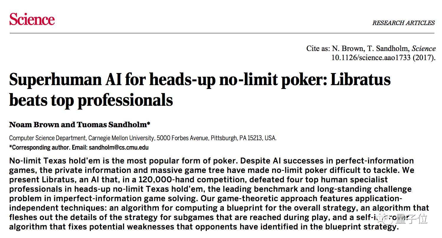在最新论文Superhuman AI for heads-up no-limit poker: Libratus beats top professionals中,卡内基梅隆大学(CMU)的博士生Noam Brown和教授Tuomas Sandholm,详细介绍了德扑AI如何通过将游戏分解为可计算、可管理的部分,来实现超越人类的表现,而且AI还能根据对手情况,修正潜在的战略弱点。