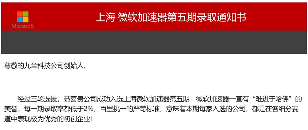 春节前夕,DataCanvas九章云极收到这封来自微软加速器·上海第五期的超高含金量录取通知书。经过三轮激烈角逐,DataCanvas九章云极凭借优异的大数据分析、智能建模和落地企业AI应用的能力,从上千家候选企业中脱颖而出,入选微软加速器!