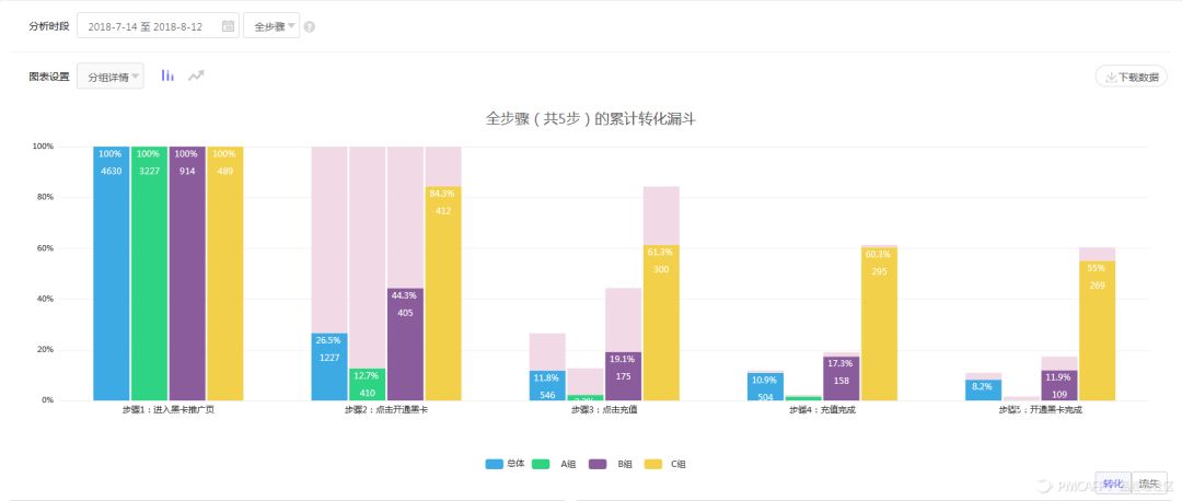 建立这三个用户群组的分析漏斗如下图所示,就可以很快的找出哪种方式对于提高会员购买转化更加有效,哪种方式会造成大量潜在付费的流失。