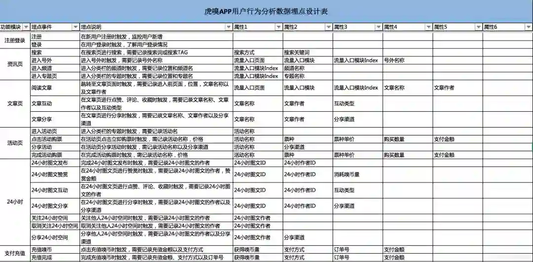 针对虎嗅APP,推荐的数据采集定义方案如下,可以根据自己产品情况调整。这里未列出用户属性与行为事件的定义。