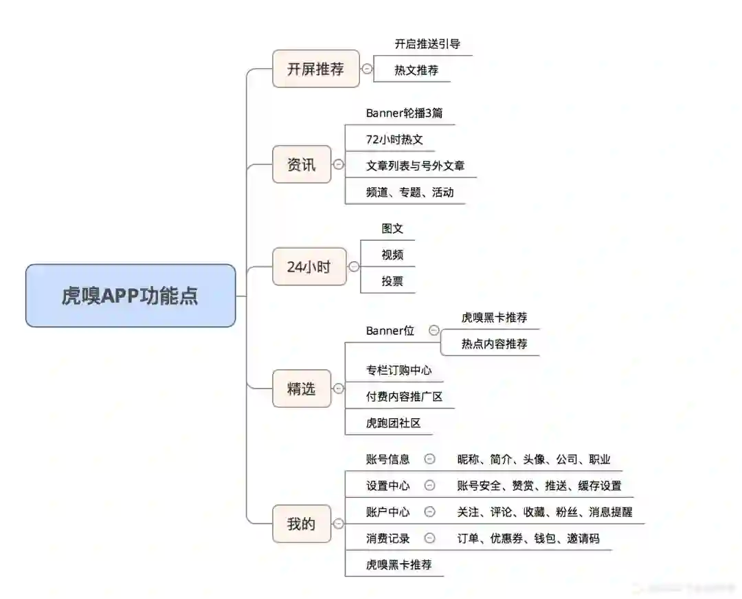 此处截取虎嗅APP的主要功能页面,并通过导图方式梳理产品功能点。