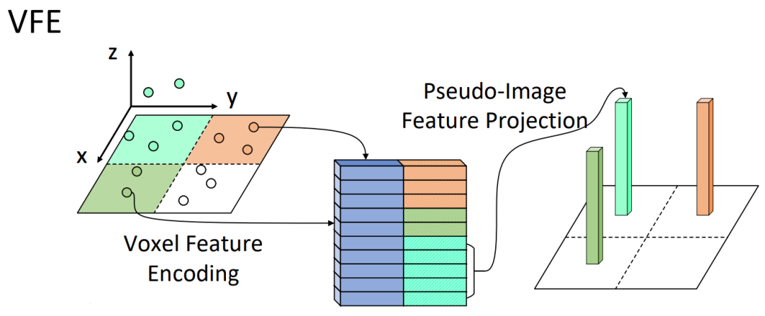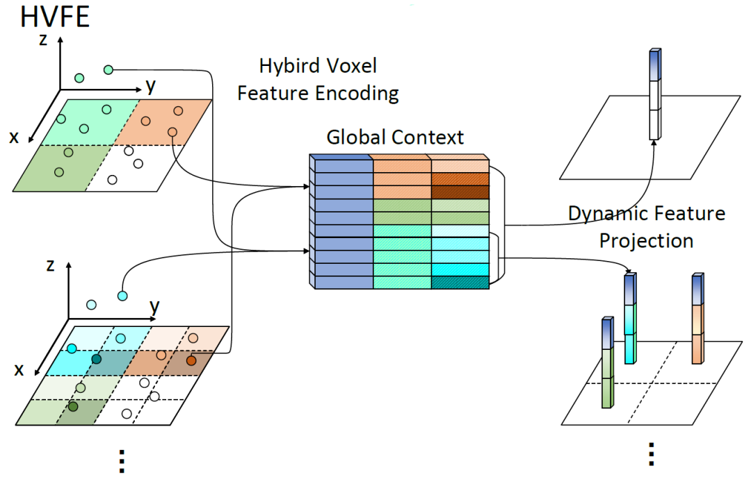 为了应对上面问题带来的挑战,我们通过多尺度的点云信息,利用注意力机制(attention),提取更加细粒度的点云特征,然后映射到更大格网粒度上,从而保证速度跟精度的平衡。传统体素特征提取网络(VFE)方法通常包含三个步骤:1.体素化:将点云指定给二维体素网格。2.体素特征提取:为每个点计算依赖于网格的逐点特征,并将其送入PointNet风格的特征编码器。3.投影:将逐点特征聚合到体素级特征,并投影回其原始网格,形成伪图像特征图。HVNet中提出的HVFE方法则将混合比例尺度下的点级别的特征聚合到全局上下文中,然后投影到动态目标尺度中的特征图上。