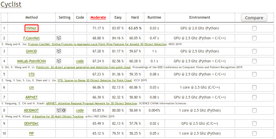 图8 HVNet 在KITTI 测试上的BEV成绩(自行车,2019年11月)