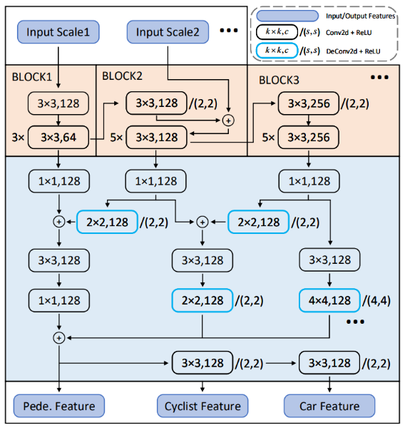 2. 2D 卷积部分,我们利用HVFE layer提出的多尺度的feature map,在特征图上面也进行多尺度的融合。由于点云的稀疏性和伪特征图的低分辨率性,我们提出了尺度融合金字塔网络(FFPN)来进行进一步的特征融合。多尺度特征首先在主干网络中浅层融合,然后在提出的FFPN网络中进行深度融合。