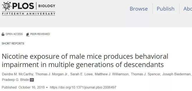 近日,来自佛罗里达州立大学医学院的科学家们发现,男性接触尼古丁可能会导致其子女、孙辈出现认知缺陷。这一研究以“Nicotine exposure of male mice produces behavioral impairment in multiple generations of descendants”为题发表在《PLOS Biology》期刊。