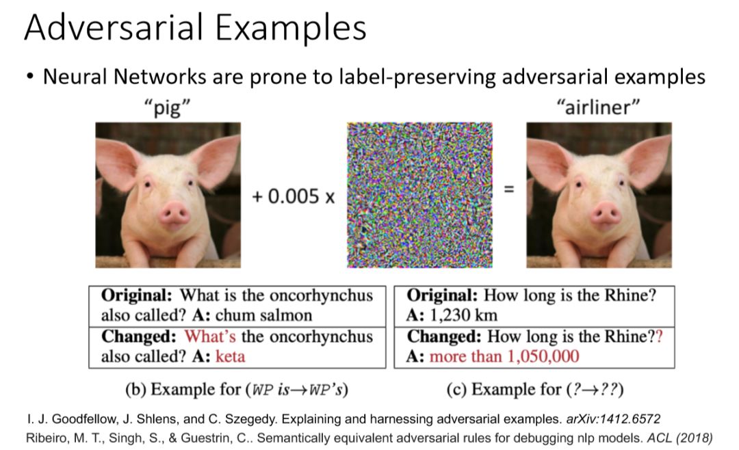 最初的对抗样本概念是基于图像领域,就是我们对一张自然的图片加一个人眼不可见 ( 微小 ) 的扰动,这种扰动不改变图像本身的类别,但是神经网络模型却把他识别为一个完全不同的类别。比如图片中本来是一个"pig",通过加入一个微小的扰动,模型却识别为"airliner"。这种对抗样本对于普通的神经网络来说几乎是普遍存在的,或者说对任意的图片我们都能找到对抗样本使得神经网络模型预测出现错误,利用这种操作我们几乎能使模型在训练集上的准确率降为0;在自然语言中也存在对抗样本,但是构造对抗样本比图像领域要复杂一些,根据Ribeiro在文章中提出的,根据一些词变换的规则 ( Semantically Equivalent Adversarial Rules ) 来生成对抗样本,比如把"What is"改成缩写形式"What's", 或者在语句结束时多加一个问号"?",就能使得基于神经网络的自然语言模型在某些情况下给出一个错误的分类。