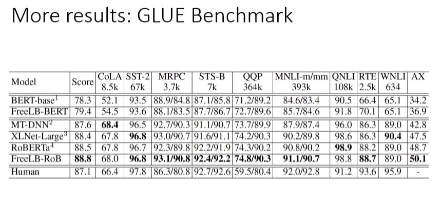 ① 我们只是在fine-tuning的阶段做了对抗训练任务,没有在Bert等类似的预训练阶段加入对抗训练,主要是预训练本身就需要较大的计算量,而对抗训练会额外增加一些计算量,所以在大量的数据集上我们没有在预训练的阶段做对抗训练;