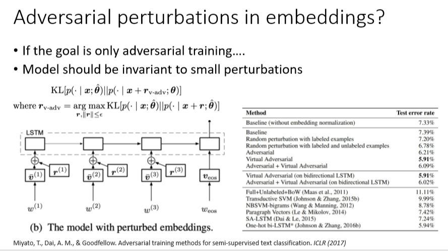 用来增强语言模型的性能,当时通过对抗训练把错误率从7.33%降低到6.21%。后来又提出了一种半监督的训练方式,在原来数据集中增加了一些没有标签的数据,通过最小化无标签数据的KL散度,最小化邻域内最大的KL散度。通过增加无标签的数据之后,错误率由6.21%降低到5.91%。在embedding中加入对抗扰动是目前一种比较有效的方式,我们的工作中也是采用了这种方式引入的对抗扰动。