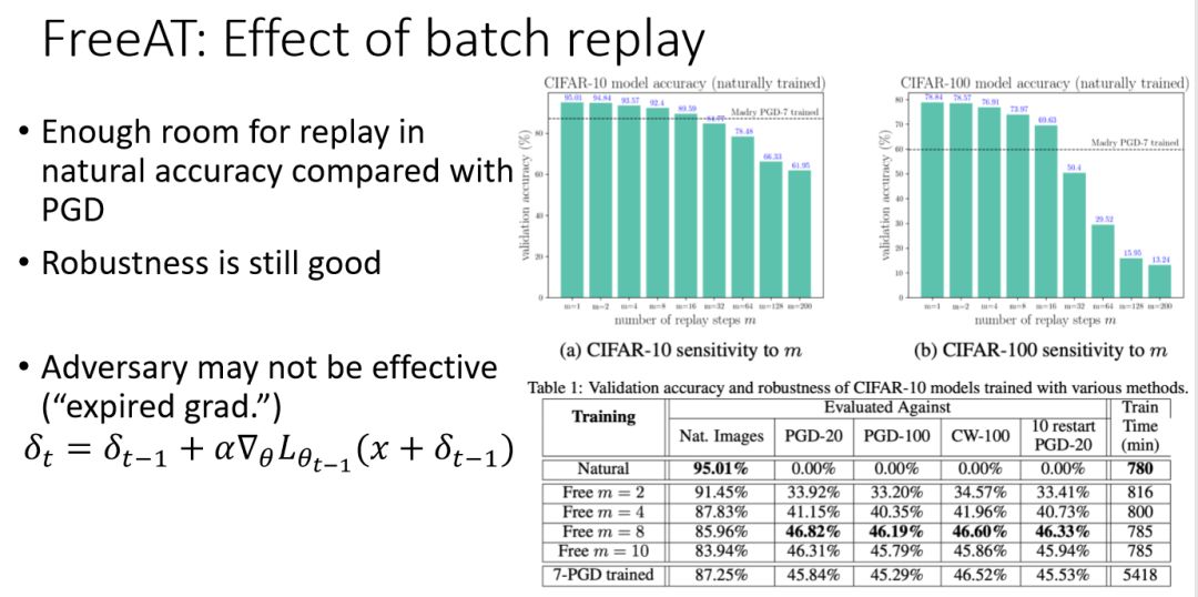 但FreeAT也有副作用,就是会在同一个样本附近更新多次参数,PGD的随机性有助于模型的泛化能力。参数在一个batch的样本上梯度下降m次得到结果称为batch replay,参数更新次数越多,模型准确率随之下降的越多。柱状图是模型普通训练方式 ( natural trained ) 的准确率和训练次数的关系,根据这个关系在FreeAT中设置replay=8,训练时间比普通模型多5min,准确率保持与PGD差不多,但是鲁棒性有所提升。