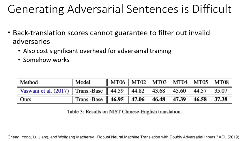 Back-translation scores 不能保证一定能生成有效的对抗样本,但确实提升模型的识别性能。在ACL paper