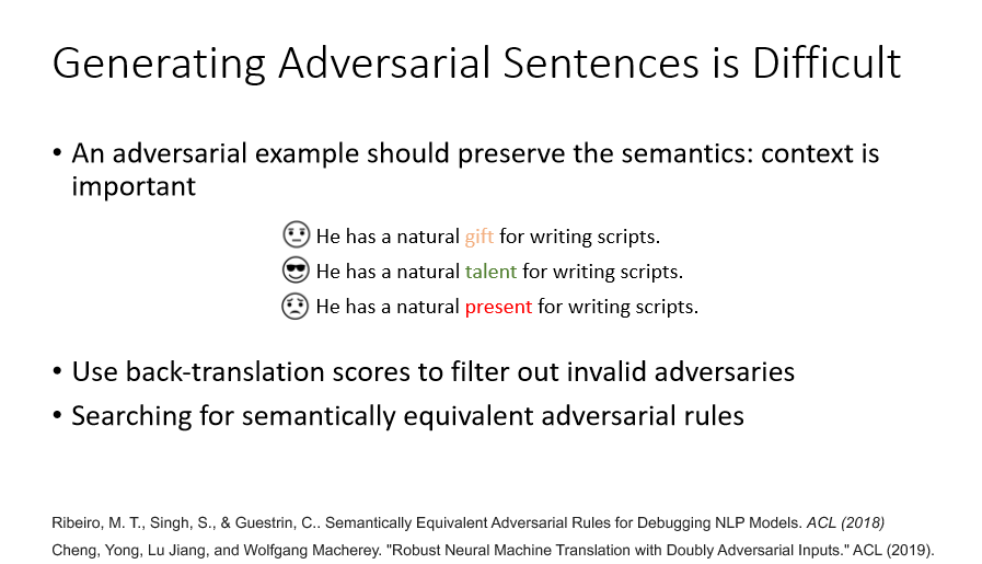 自然语言中生成对抗的句子是有一定难度的,一般最常用的方法,是把句子中的一些词替换成他的近义词。对扰动也采用一种梯度上升的方式,具体做法是通过替换后的embedding向量和原句子的embedding向量求得差向量后,再求与梯度向量求夹角,夹角越小说明对损失函数的增加越多。一般情况下都是通过这种方式结合近义词替换的约束来构造一些对抗样本,但是这种近义词替换与上下文关系密切,所以有时候也存在一些不合理的情况。比如图片中"He has a natural gift for writing scripts."中的"gift",在此句中是"天赋"的意思,第二句中的"talent"也有天赋的意思,但是第三句中的"present"虽然和"gift"也是近义词,都有"礼物"的意思,但是在上下文中确实不合理的。采用这种词替换的方式时还需要结合其他约束方式来过滤掉那些不合理的对抗样本,比如使用back-translation scores,但是这种方式需要使用额外的机器翻译模型,在每次生成对抗样本时检测一次,这种方式的效率非常低;另一种方式就是找一些通用的语言规则,比如缩写 ( what is 替换成 what's ),名词换成指示代词 ( noun>this/that/it ) 等语义等价对抗规则 ( semantically equivalent adversarial rules,简称SEARs ) 方式来生成对抗样本。