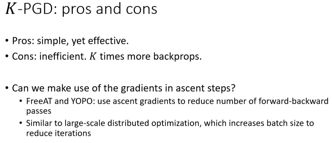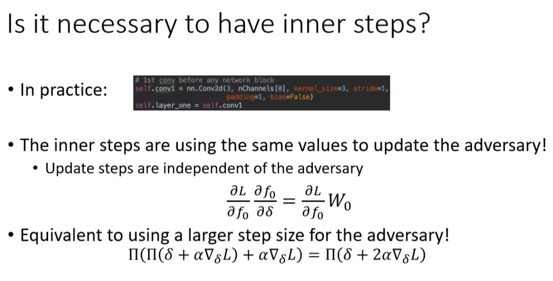 文中所说的第一层是卷积操作,而卷积的操作是一个线性操作,所以第一层的梯度是一个常数,这样inner step中传递的梯度与对抗样本无关,虽然考虑了projection的梯度上升过程,比如循环了2次,那么只是相当于是用了两倍的步长更新参数,inner step没有起到明显的作用。但是文章提出的对抗训练思想还是很有借鉴意义的。