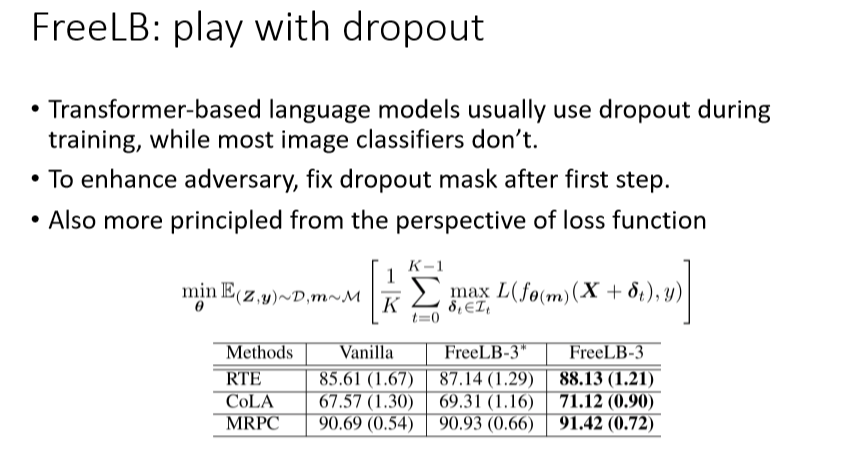 Dropout的影响在图片的抗训练领域里没有得到广泛关注,因为目前在图像领域在大多情况下已经不再使用Dropout了,但是在基于Transformer的语言模型里还是需要使用Dropout,即使是在fine tuning过程,我们仍使用了Dropout。为了增加对抗的强度,我们需要在每步梯度上升时固定Dropout Mask, 这与FreeAT过期问题相似,因为网络每一层的结构都不相同,得到的输入梯度有很多的噪声。从目标函数的角度来看,我们想优化对于不同dropout mask下损失函数的期望,损失函数在K-step里是所有样本损失之和,所以需要在每一步里的dropout保持相同。