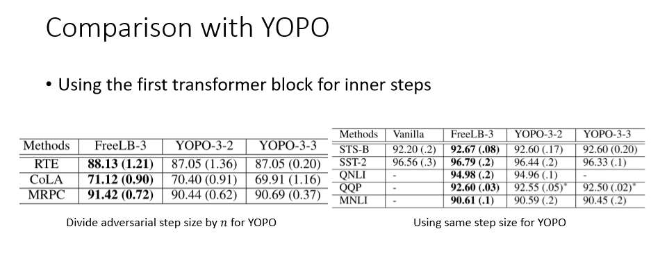 我们尝试了不同inner step的数量,YOPO-3-2 就是包含了2个inner step,YOPO-3-3 就是包含了3个inner step。同时,为保证等效步长一致,在左图中,我们还将每个inner step的长度换成FreeLB-3的梯度上升步长除以inner step数。而在右图中每个inner step的步长和FreeLB一致,这样YOPO等效步长更长。根据实验结果,我们发现inner step过程没有表现出期望的结果,有时增加inner step还会使结果变差。步长大一些的时候 ( 右图 ) YOPO与FreeLB的差距会缩小,但仍然没有变得更好。